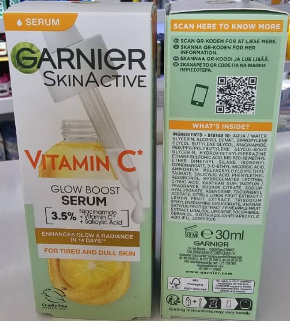 یکی از عوامل موثر در شادابی پوست و همچنین درخشش و سلامت آن، ویتامین C می باشد. نیاسینامید با حفظ رطوبت پوست و کنترل چربی، باعث استحکام پوست و افزایش حالت الاستیکی آن می شود. سرم ویتامین C گارنیر GARNIER مدل GLOW BOOST با دارا بودن مواد ذکر شده بعلاوه سلیسیلیک اسید، پوست شما را روشن و درخشان کرده و با افزایش حالت الاستیکی آن در 14 روز باعث رفع چین و چروک و جوانی پوست شما می شود.